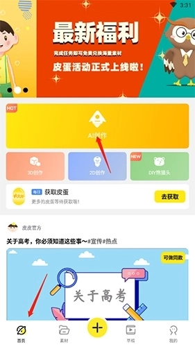 1、启动软件后,点击底部的“首页”选项,接着选择“AI创作”功能。