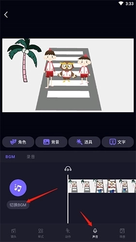 1、打开编辑页面,找到并点击“声音”选项,接着点击“切换BGM”选项。