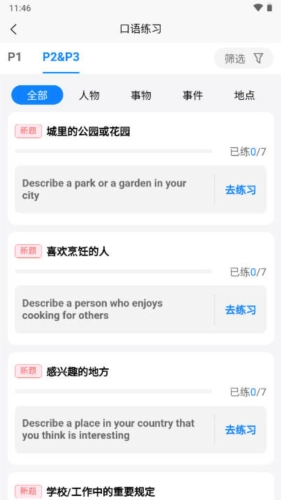 口语练习板块设置了丰富多样的口语练习题目,助力用户开展口语训练,同时还会给出具有针对性的解析与评估反馈。
