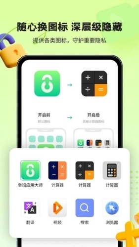 鲁班应用大师是一款功能强大的手机应用隐藏工具,致力于为用户打造安全的隐私空间。借助这款应用,用户能够对软件进行加密、更换图标等操作,从而切实守护个人隐私。该软件配备了便捷好用的隐私工具箱,让用户可以轻松地加密和隐藏手机里的各类应用,构建一个安全的私密空间,用于妥善存放各类应用、照片与视频。用户还能根据自身需求伪装应用、给应用加密,进而创建专属的隐私空间来保护个人信息。