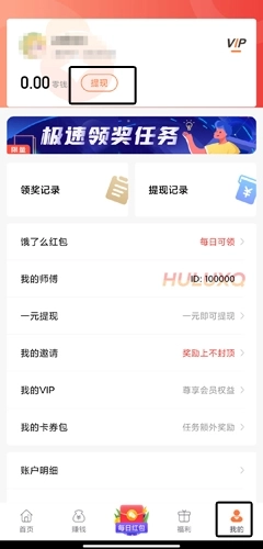 1、用户在我的页面中点击一元即可提现按钮;