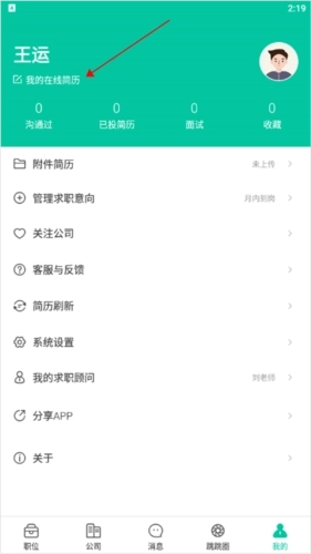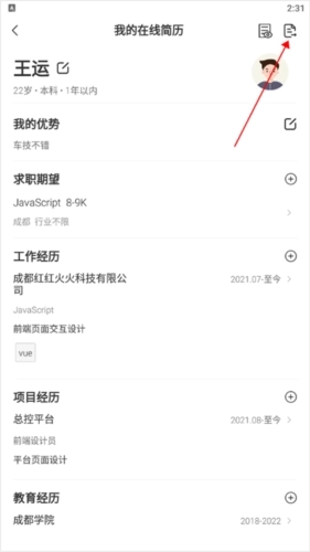 6、若用户手机上没有其他简历,可先进入【我的】页面,打开【我的在线简历】对简历进行修改,完成后点击页面右上角的导出图标(即下图红色箭头所指区域),即可将简历导出。