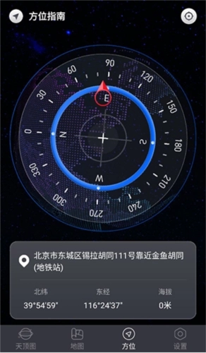 用户在方位页面能够查看自身当前的方向位置与经纬度,点击右上角的瞄准图标即可开展水平校准操作。