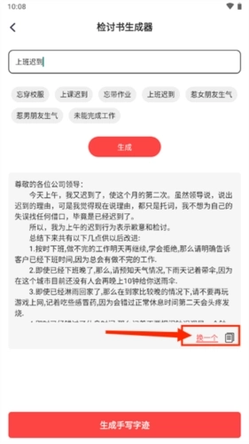4、输入想要生成的检讨主题,例如上班迟到,点击生成按钮后就会呈现出对应的文章,如果对生成的内容不满意,还能更换一篇。