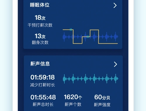止鼾及睡眠监测——和智能止鼾腰带结合使用,可实时监测产品的止鼾数据、监测用户的深浅睡眠/体动翻身/呼吸率/无呼吸努力等状态和数据,自动生成止鼾报告,直观展现产品的止鼾效果、评估用户的睡眠质量好坏,预警用户身体可能存在的疾病隐患。