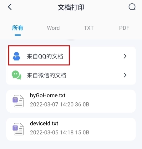 2、在文档打印页面中点击来自QQ的文档;