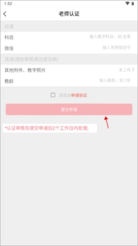 3、填写对应的信息,上传本人任教的照片与文档,勾选“请阅读申请协议”,最后点击提交申请即可。