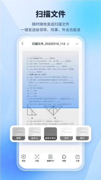 3.全能扫描功能:可实现文件扫描、证件扫描、试卷扫描、笔记扫描、票据扫描、合同扫描、照片扫描,还具备去手写、水印相机等实用功能。