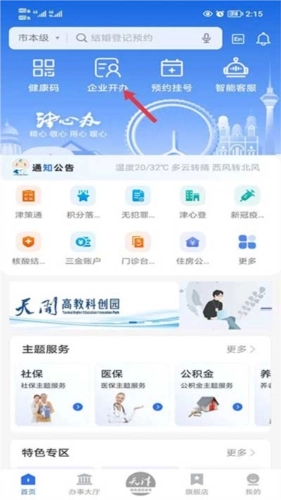1、首先,打开津心办并点击首页中的企业开办选项;