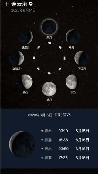 【月相】功能支持查询不同港口的日出日落、月出月落时刻,还能查看当日的月相状态,帮助您更清晰地了解潮水与月相的关联,方便您进行钓鱼、赶海等活动。