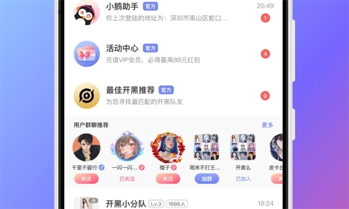 2、开黑广场,精准匹配靠谱队友,助力游戏轻松上分,还能和线上的游戏好友随时互动。