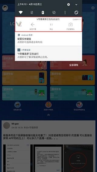 4、小编在录屏时打开软件,能看到手机录屏状态变为停止录屏,屏幕上还显示着录制时间,与此同时通知栏也出现了对应的图标。