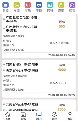 3、国内方面:您能够自主挑选物流信息,并且可以在线上与司机取得联系;