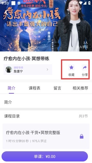 3、进入课程详情页后,可点击【收藏】方便后续查看,也能点击【分享】推荐给他人。