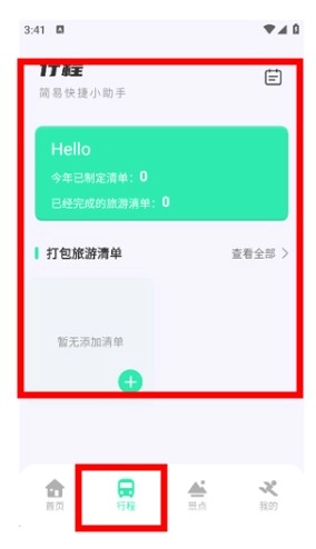 2、进入“行程”页面,点击+号按钮,可以新增旅行清单。