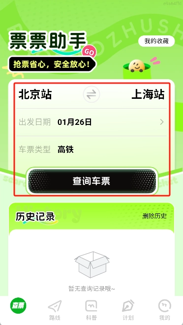 为我们提供了精准且迅捷的火车票信息查询服务,涵盖了全国各地的列车时刻表。此外,还支持一键收藏火车票信息功能,我们可以方便地随时查看所需车次详情。更值得一提的是,票票助手能够自动保存我们的查询历史记录,便于自己随时回顾并快速查询常用路线,从而极大地提升了整体使用体验。