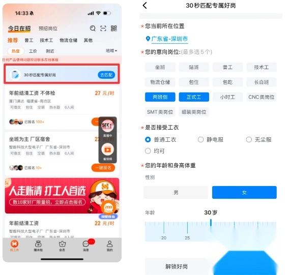 2.更新后在首页就可点击智能荐厂,根据需求选择,30秒即可匹配好岗,工友们可收藏岗位,按需进厂哦~