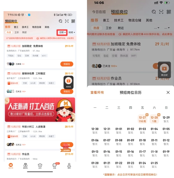 4.预招不仅可以选地域,也可选择日期啦!您可以任意选择一天,查看是否有工厂招工