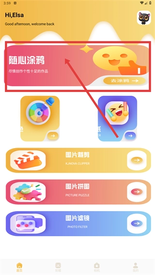1、在首页找到【随心涂鸦】模块,点击其中的【去涂鸦】按钮,即可进入涂鸦创作界面,开始进行个性化绘画。