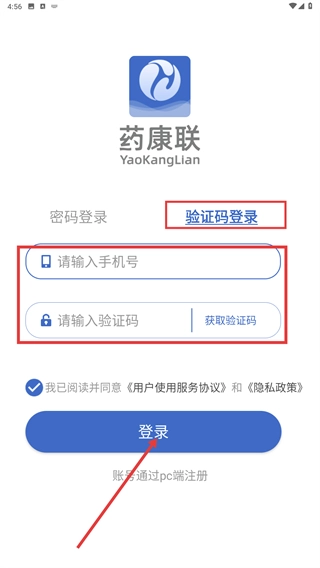 4、若选择【验证码登录】方式,先输入手机号,接着点击【获取验证码】,随后填写收到的验证码,再勾选相关协议,最后点击【登录】按钮即可完成验证流程。
