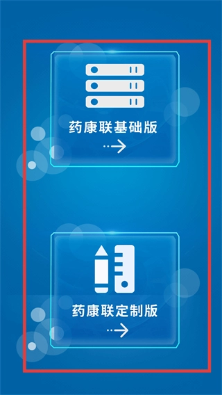 2、在版本选择页面,挑选【药康联基础版】或者【药康联定制版】,即可进入对应版本的登录环节。