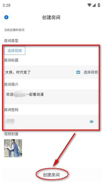 “选择视频”指的是挑选打算一同观看的动漫,房间简介与密码可自由设置,之后点击“创建房间”即可。