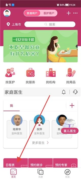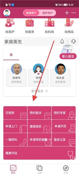 1、打开软件进入首页,查看找医护找服务等功能入口,浏览家庭医生列表,可选择对应医生,也能点击更多医生查看更多选项。