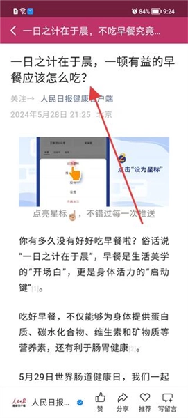 3、点击首页的健康资讯内容,进入详情页查看文章内容,了解早餐相关的健康知识。