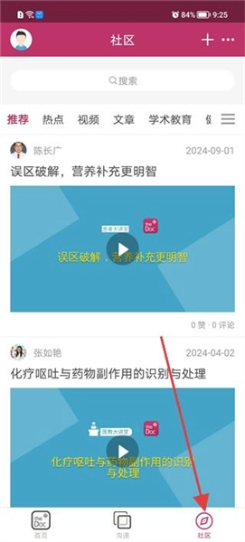 4、切换至社区页面,浏览推荐的健康相关视频文章,查看不同作者发布的内容,了解健康知识及医疗相关技巧。