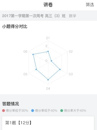 1、支持校长、年级组长、班主任和学生访问阅卷系统。校长可以查看所有年级的考试数据和分析报表,年级组长可以监控和督促教师评阅,查看本年级各班考试数据和分析报表,班主任可以查看本班考试数据和分析报表,学生可以查看本人考试成绩、本人答卷、优秀答卷,也可以查看本人本次考试的学科成绩均衡性雷达图,每科每题的成绩均衡性雷达图。
