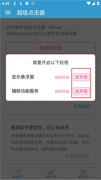 1、启动超级点击器后,一般会弹出提示,要求开启“显示悬浮窗”功能与辅助功能权限。请按照系统给出的指引,把这两项权限都设置为允许或开启状态。