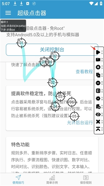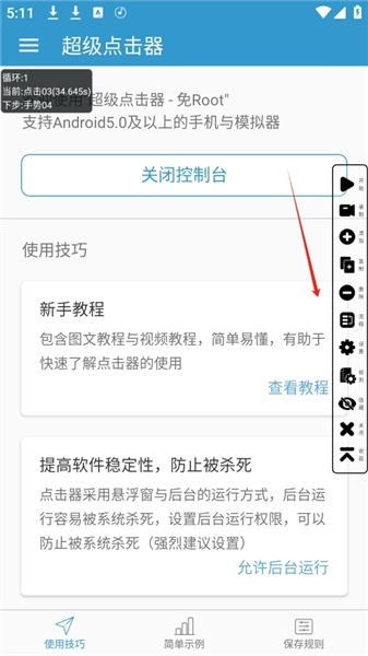 5、完成上述设置后,点击悬浮窗里的开始按钮,超级点击器便会依据设定好的步骤与参数,自动进行点击或其他相关操作。