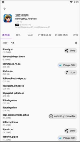 2、点击进入到任何游戏或者软件应用可以查看原生库、服务、活动、广播接收器、内容提供其、权限、元数据等各种信息。