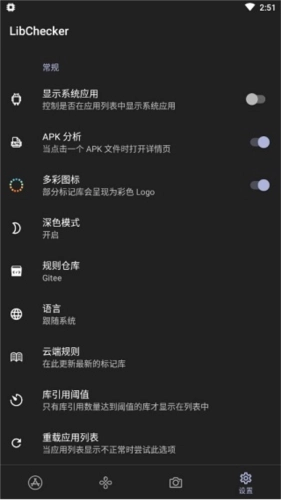 3、其次就是设置,在这里有主题背景颜色、APK分析、规则仓库、语言、云端规则等等,根据需要进行适当的调整。