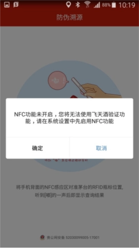 进入“茅台防伪溯源”主界面后,将手机背面的RFID感应区对准茅台酒瓶盖顶部。
