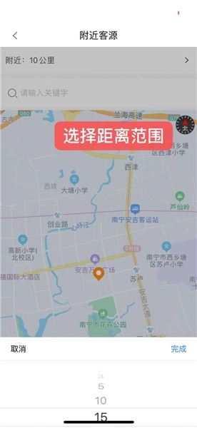 打开【附近客源】功能,接着设置查询范围,然后输入获取到的关键信息,最后点击开始查询按钮。