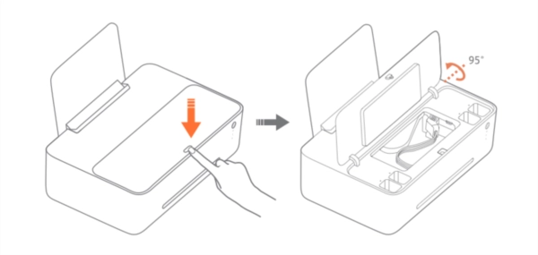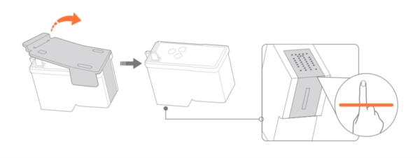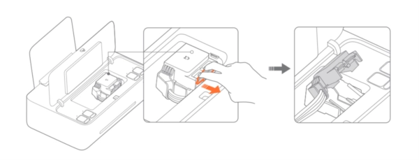 在打印机处于开机状态时,安装好墨水瓶后,打印头架会自动滑出,此时拉动打印头架前方的灰色卡扣,打印头架盖便会弹开。