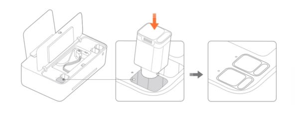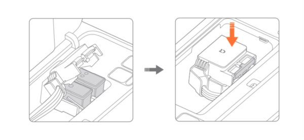 将墨水瓶的圆柱端朝下,对准对应颜色的墨坑用力按压,要保证墨水瓶底部和墨坑上沿处于水平状态,这样就完成安装了。