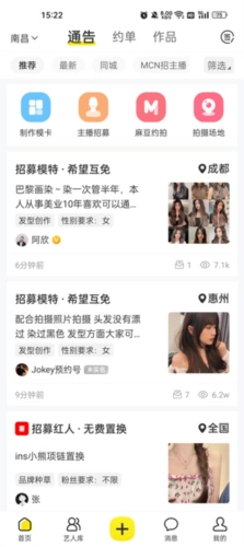 商家、经纪人可以在平台发布活动通告与招募信息的