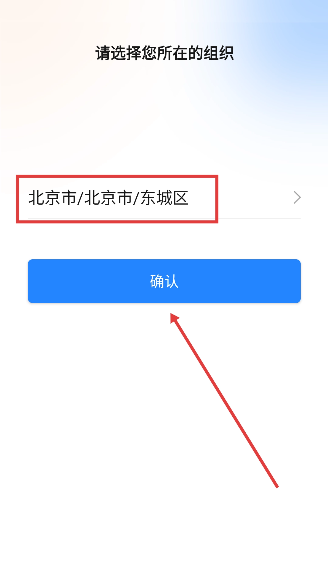 2、举个例子,选择【北京市/北京市/东城区】后,点击【确认】按钮。