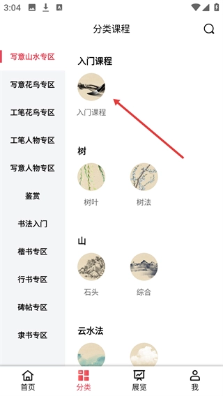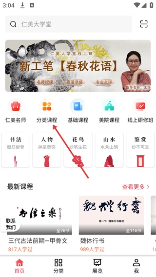 1、点击首页的【分类课程】选项,进入课程分类页面后,就能选择不同艺术领域对应的课程专区了。