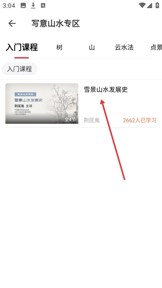 3、在课程列表里挑选目标课程(例如【雪景山水发展史】),进入该课程的详情页。