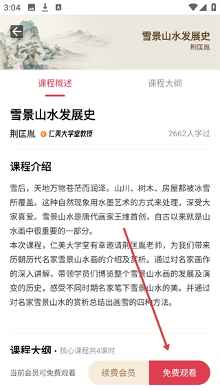4、进入课程详情页面后,可查看课程介绍与大纲,点击【免费观看】按钮,即可开启该课程的学习。