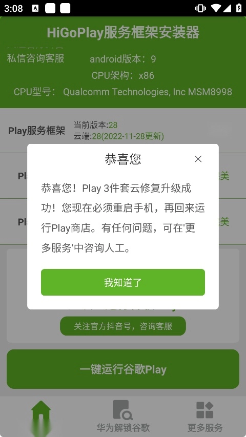 4、Play3件套云修复升级完成后,需要重启一次手机,才能激活谷歌play的全部功能