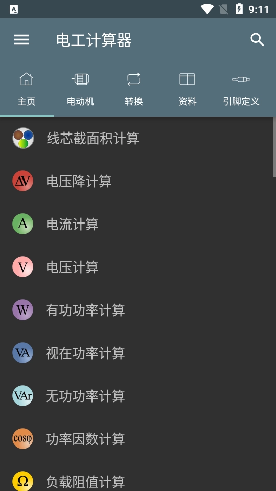 1、在魔趣网下载并安装电工计算器最新版。运行软件进入首页后,可以看到主页、电动机、转换、资源等功能板块。