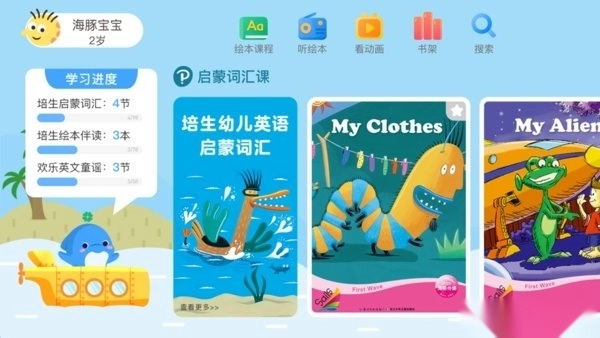 字母入门,词汇拓展,单词短句,视听素材,绘本读物,睡前故事,亲子情景对话一应俱全,多方位提升孩子听说能力。