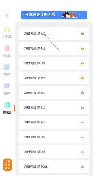 打开软件后,进入单词板块,找到词根词缀的分组列表并查看,从中选择词根词缀第1组,随后进入该组对应的词缀学习页面。