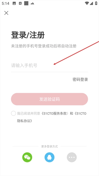 2、进入登录/注册页面后,在【请输入手机号】输入框内填写相应的手机号码。
