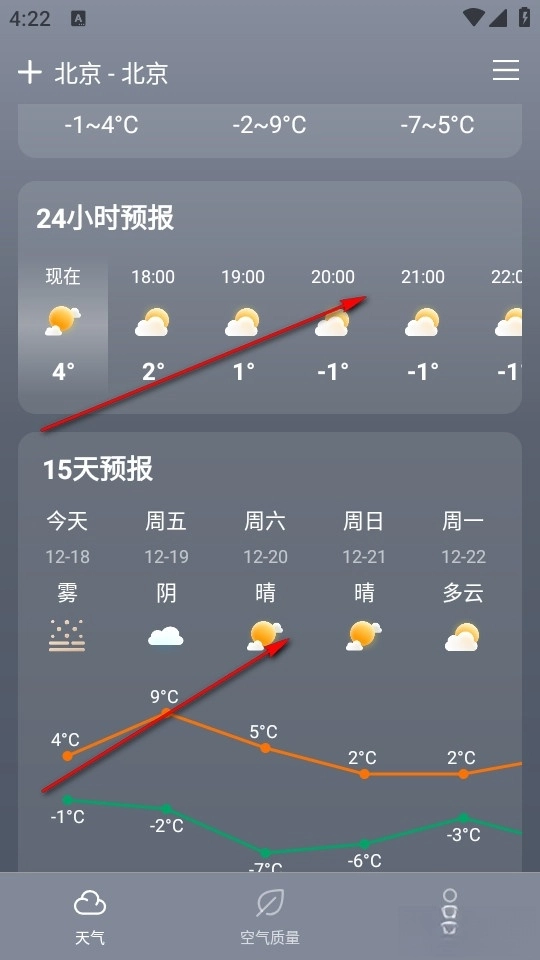 打开软件后,就能看到当前所在城市今日的具体气温和空气质量信息,下方则显示着明天及未来几天的天气预报。