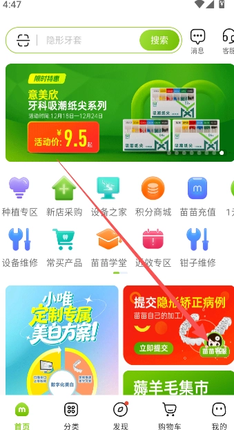 1、梅苗苗商城的客服入口主要设置在首页,您可以点击页面下方的“苗苗客服”选项进入客服沟通界面。